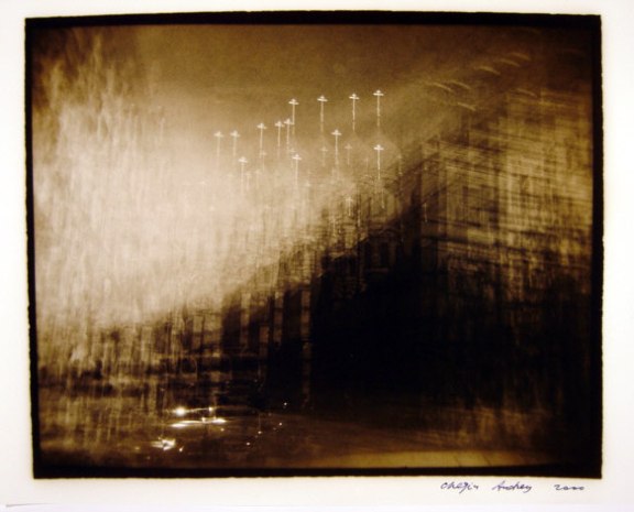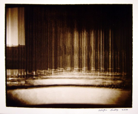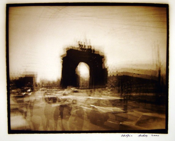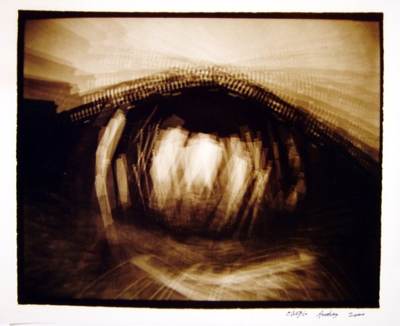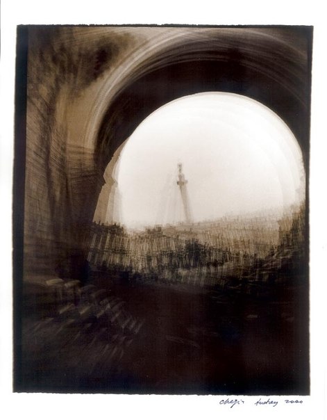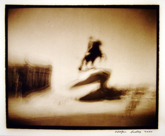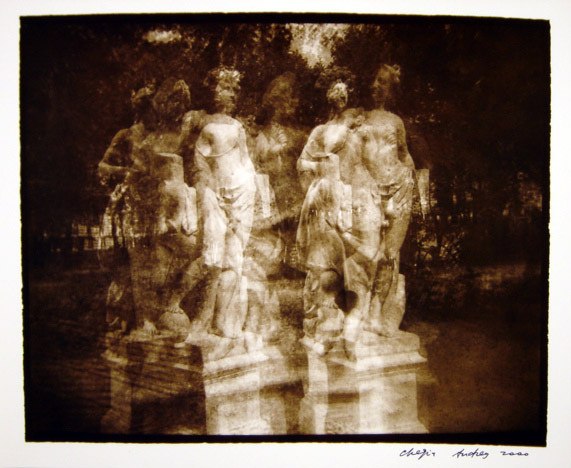 Из серии «С.-Петербург», 2000 г. Старая советская пленка, ч/б фото, сепия. Снято несколько разных скульптур в Летнем саду, по 10-12 экспозиций на каждую скульптуру[/caption] В-третьих, на объектив навинтил красный светофильтр К-8 (конечно, можно использовать другие цветные, и не только цветные, фильтры), зарядил в камеру советскую черно-белую пленку 70-90-х годов и в хорошую солнечную погоду стал делать до 50 экспозиций на один кадр. Стою и дергаю за курок — камера прыгает в руках, и на один кадр накладываются до 50 дискретных одинаковых изображений с небольшим смещением относительно друг друга. Старая фотопленка сама по себе уже имеет вуаль, а советская, из-за бумажного ракорда, сделанного из непонятно какой бумаги, хотя и черно-красной, имеет непредсказуемую фактуру даже в одной партии пленки. В результате вуаль автоматически становится 51-й экспозицией, или первой и самой главной. Честно говоря, я не всегда считаю количество экспозиций — дергаю за курок, пока есть желание. Если погода серая, можно убрать фильтр и снимать без него, набивая в кадр чувствительность старой советской пленки. Конечно, проявлять такую пленку лучше самому в специальном проявителе для вуалирующих слоев. В-четвертых, на камере есть горячий башмак, и, соответственно, можно делать мультиэкспозиции со вспышкой, да еще на цветную пленку. Китайцы, конечно, молодцы — из пластиковой мыльницы сделали бренд и модифицируют его, как хотят. Так вот, они поставили на «Хольгу» вспышку с поворотной головой, где при повороте меняется цвет вспышки (желтый, синий, красный). Для съемки на цветную пленку это очень удобно — вспышкой высвечивается только передний план, а задний остается нормальным. Я никогда не фотографировал на «Хольгу» в одну экспозицию и всегда удивляюсь тому, как другие фотографы это делают. У меня создается впечатление, что они, снимая в одну экспозицию, хотят доказать себе или китайцам, что эта пластиковая камера работает и действительно может делать фотографии. Взяв в руки «Хольгу», я думал прежде всего о том, что нового можно сделать с ее помощью. Думаю, мне кое-что удалось. Фотографирование для меня — это некая игра с пространством, временем, людьми, наконец, с самим собой. Есть игры, в которые играешь с детства; бывают игры интересные и не очень; игры, в которые ты продолжаешь постоянно играть; а также игры, в которые никогда играть не будешь. Такая простая камера дает возможность играть и самостоятельно назначать правила. Результатом становится негатив или слайд, который ты потом выбираешь. Мне интересно фотографировать движущиеся объекты методом мультиэкспозиции — за ними на негативе остается след движения. Если так же снимать светящиеся или отражающие поверхности и перемещать при этом саму камеру, тоже создается эффект движения, но иной. Это как использовать камеру в качестве прибора для рисования светом. На выдержке от руки можно фотографировать 100-ваттную лампочку в мастерской, двигать камерой и пытаться нарисовать что-либо. Когда художник рисует, он видит то, что нарисовано, здесь же изображение создается в голове, и надо движением камеры зафиксировать его на пленке, видя только нить накала. Я назвал такой метод фотографирования «светописью». Также интересно снимать на темном фоне с высвеченными фигурами, при этом перемещать пленку не на всю длину кадра, а как 
