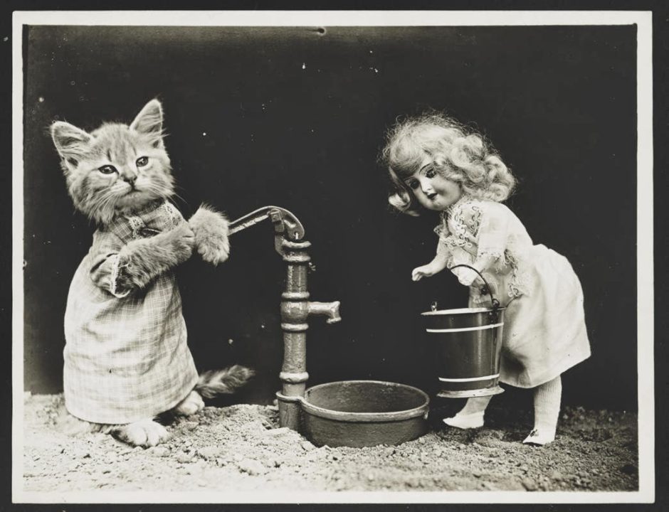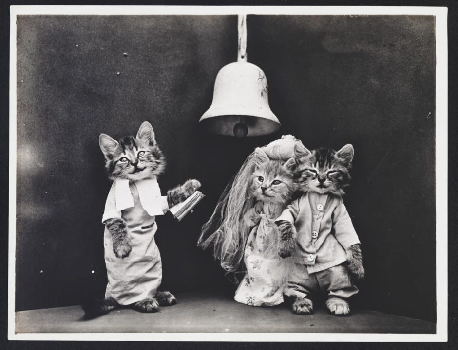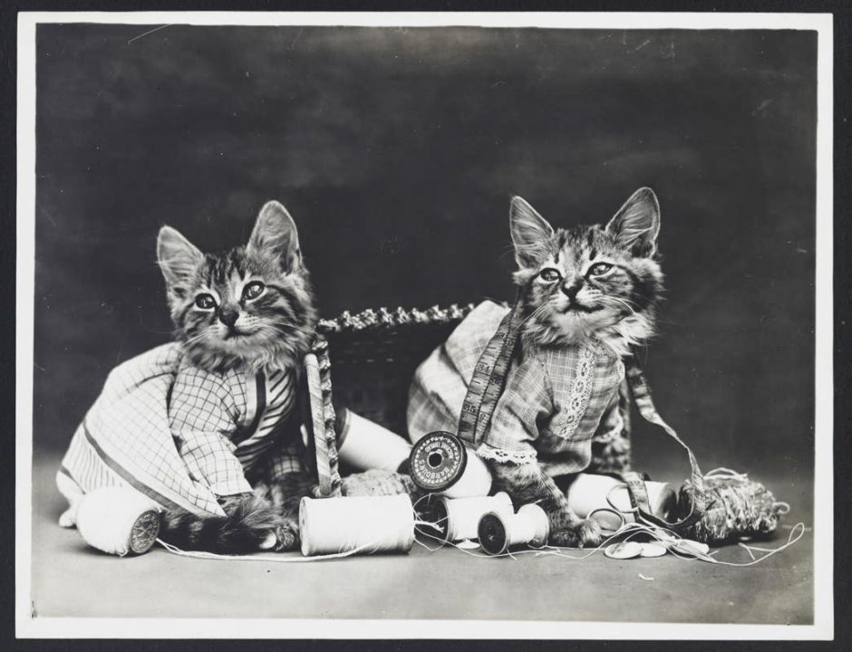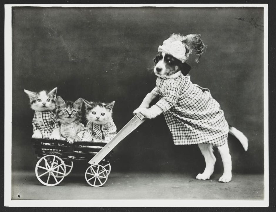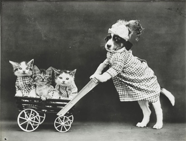 Эти фотографии были сделаны в начале 20-го века американским фотографом Гарри Уиттье Фрисом (Harry Whittier Frees) (1879-1953), который, одевая своих котят, Рэгса и Пушистика, а также других домашних животных (собак, свиней, кроликов и птиц) своих друзей и соседей, фотографировал их в человеческих позах, за вполне обычными человеческими занятиями.