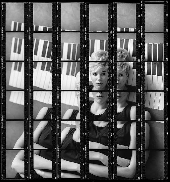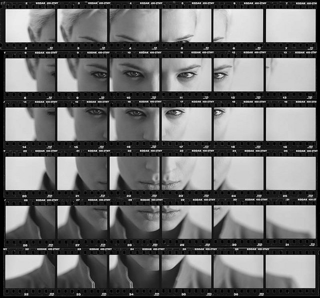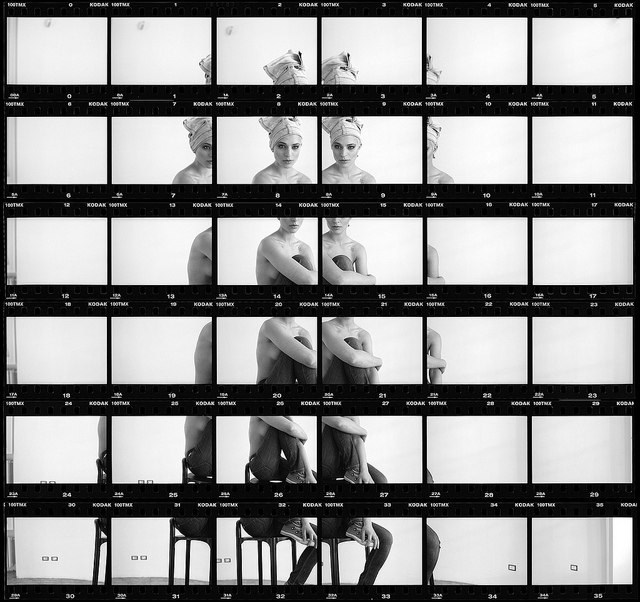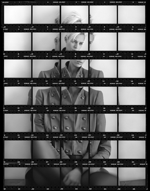 Итальянский фотограф Марио Занария снимает на фотоплёнку моделей и печатает вот такие контакт-принты. Не самый простой, но прекрасный способ освежить своё портфолио:) Кто незнаком с аналоговыми процессами в даркруме, можем в двух словах пояснить, как получаются такие контактные отпечатки. В данном случае чёрно-белая плёнка разрезается на полоски по 6 кадров, которые выкладываются на лист светочувствительной бумаги, прижимаются стеклом и экспонируются светом лампы фотоувеличителя. В отличие от 'обычной' оптической печати, изображение не проецируется на бумагу и не увеличивается. Контактные (или контрольные) отпечатки имеют такой же размер, что и реальные кадры на фотоплёнке. А контрольными отпечатками они называются из-за того, что во времена отсутствия сканеров контакт-принты с плёнки были единственным способом увидеть 'превью' изображений для последующего отбора работ. Некогда техническая необходимость для кого-то стала художественной возможностью. И Марио Занария - не единственный, хотя и очень удачный тому пример. Как вам эта серия?