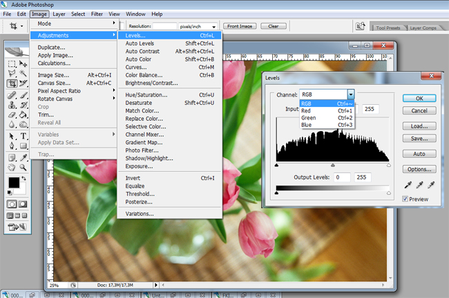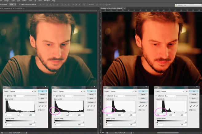 Цветные фотографии требуют коррекции вначале с помощью точки чёрного, а затем точки серого - и всё это в каждом цветовом канале по очереди (красный, зелёный, синий), потом в общем канале можно отрегулировать общую плотность изображения.