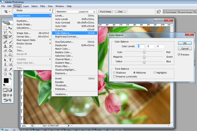 Затем может быть применён инструмент color balance для среднего диапазона, чтобы придать фотографии более визуально ‘правильный’ общий тон после корректировки кривых. Использование color balance при работе с тенями, например, может помочь уйти от ‘паразитного’ оттенка в тенях.