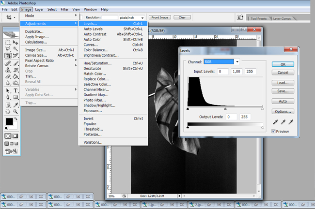 После удаления пылинок начинается работа с гистограммой уровней levels - процесс регулировки уровней интенсивности в тенях, средних тонах и светлых участках изображения. А если проще - это и есть тот самый баланс тонов фотографии, о котором мы так часто говорим. Ручная коррекция уровней в случае с чёрно-белыми плёнками касается в основном точки чёрного, реже точки серого и совсем редко точки белого.
