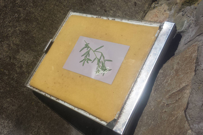 Экспонируется изображение на солнце (или УФ-лампой), время экспозиции сильно зависит от интенсивности света – от получаса при прямом ярком солнечном свете до нескольких дней, среднее время при рассеянном освещении 4-8 часов. Также стоит учитывать толщину растений – толстым листам потребуется больше времени для прорисовки деталей. После экспозиции изображение стоит промыть в воде в течение пары минут и столько же фиксировать в стандартном разведении 1:9, затем тщательно промыть лист от остатков фиксажа в течение 15-20 минут и оставить сушиться. Готовое изображение можно сканировать, в том числе и у нас в FOQUS LAB :)