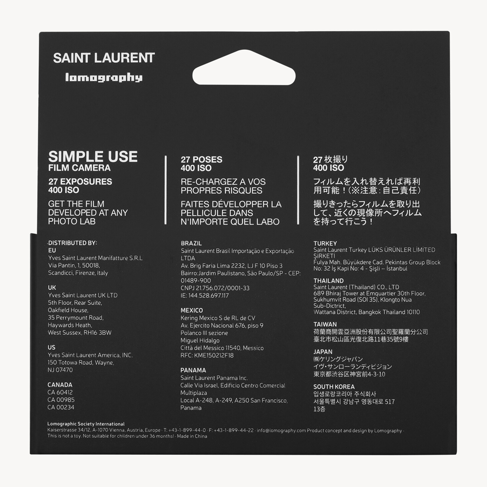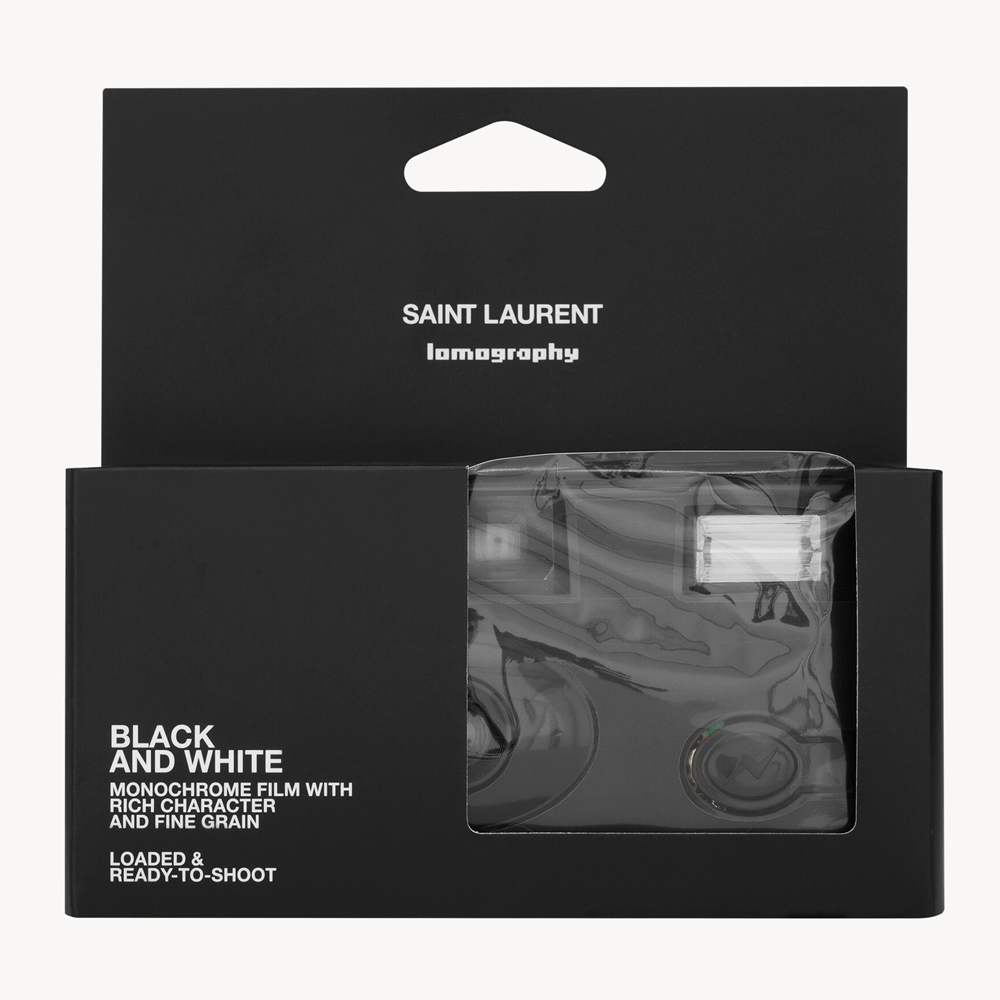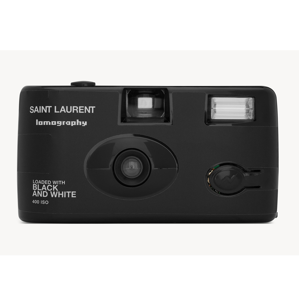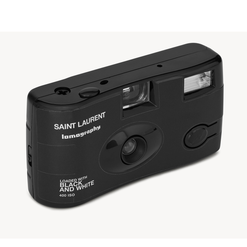 Камера выполнена в фирменном стиле Saint Laurent: корпус матового чёрного цвета с глянцевой тиснёной монограммой "YSL" на передней панели.