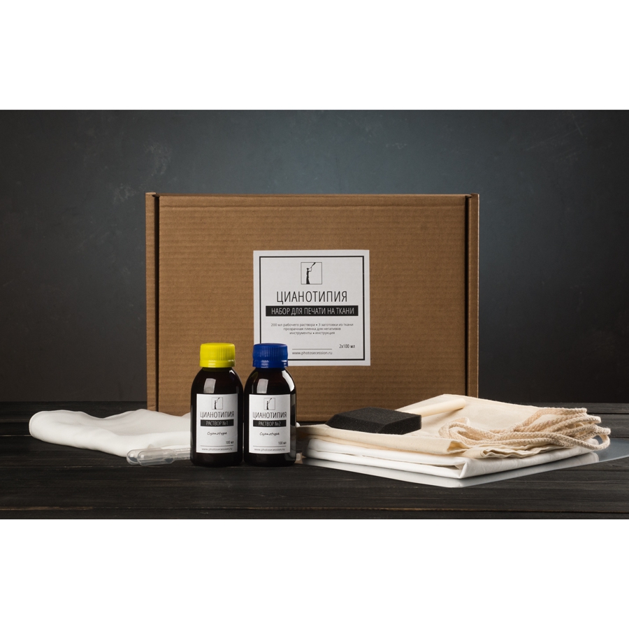 Все необходимое для цианотипии на ткани в домашних условиях в одной коробке - заготовки из натурального шелка и хлопка, химия и инструменты.